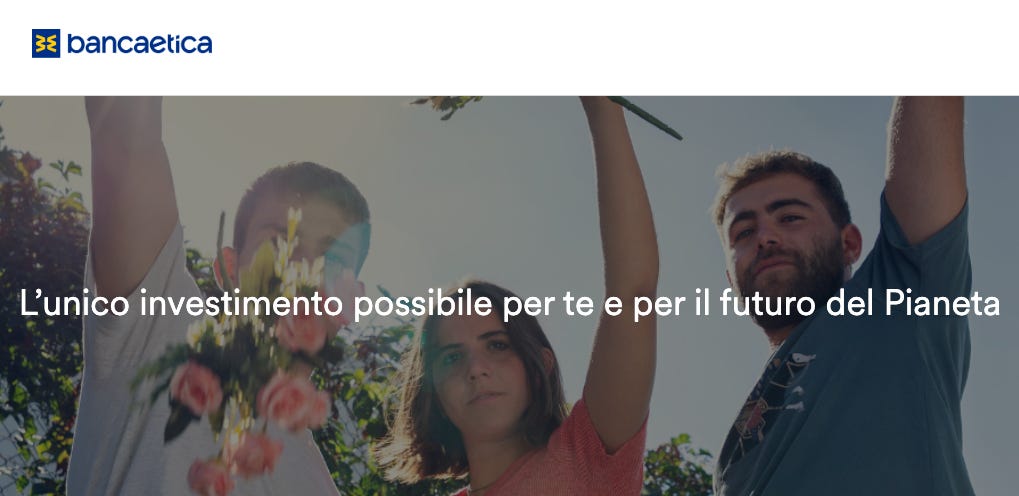 Grazie allo sponsor, che supporta le ore di lavoro e studio per questa newsletter: oggi è Banca Etica, che presenta un nuovo modo di investire i propri soldi, direttamente online, guadagnandoci ma senza sconti sull’etica.