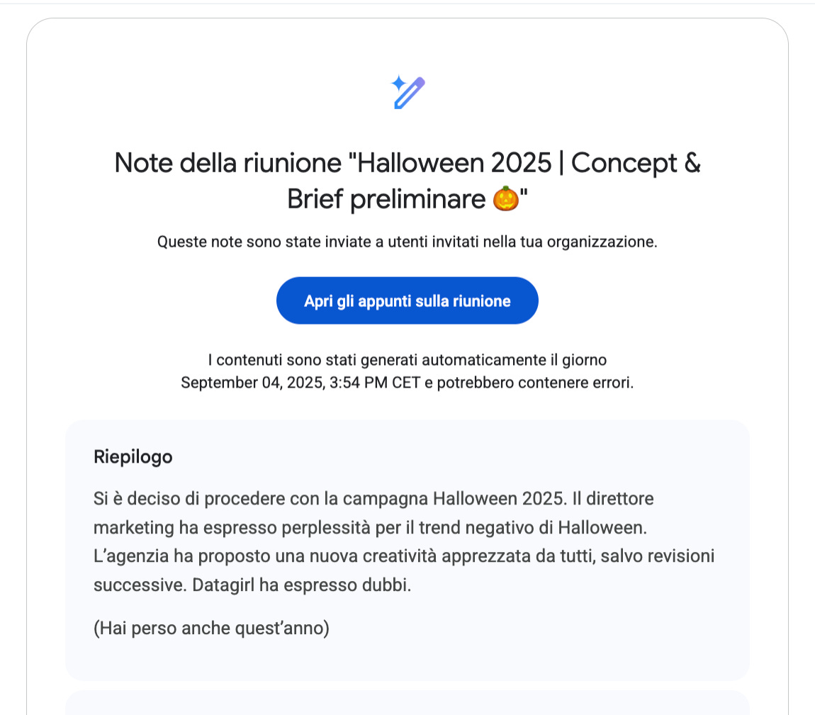 È la prima settimana di settembre. Fuori ci sono ancora 30 gradi, ma nel reparto marketing si parla di HW25. Sul calendario condiviso la riunione si chiama Halloween 2025 | Concept & Brief preliminare 🎃. L’emoji è stata aggiunta dall’agenzia. È la riunione di rientro: la scusa per rivedersi dopo le ferie, anche se nessuno si rivede davvero perché ovviamente è su Teams. La riunione con quell’aria fintamente energica, in cui ci si raccontano le vacanze e si tengono per un po’ gli sfondi finti della call a tema spiaggia o montagna.