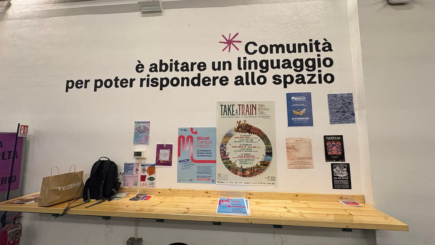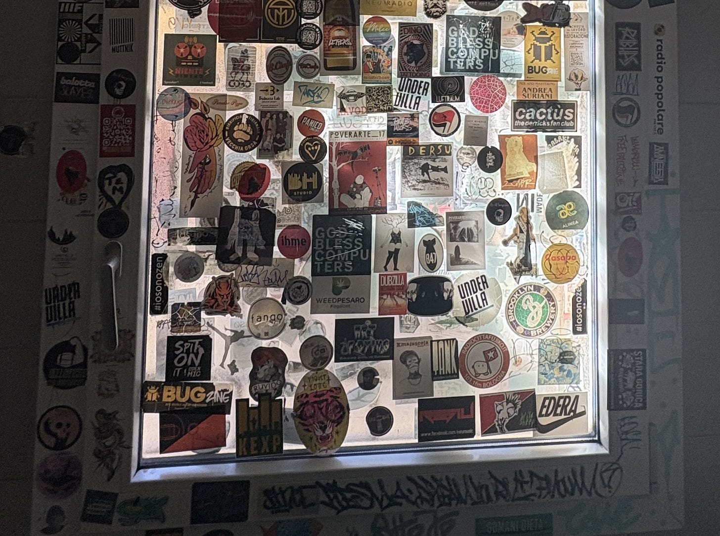 A Bologna c’è un bar, uno di quelli della cittadinanza attiva, di quartiere — io ci vado perché è vicino al coworking. Il loro bagno (come è nella norma per questi locali) è una mostra permanente di adesivi: band, collettivi, eventi, piccoli brand che non hanno i soldi e proprio per questo li spendono meglio degli altri. Chi li ha incollati sapeva chi entra da quella porta. Non aveva bisogno di un pixel di tracciamento: il filtro è per interessi e geolocalizzazione.