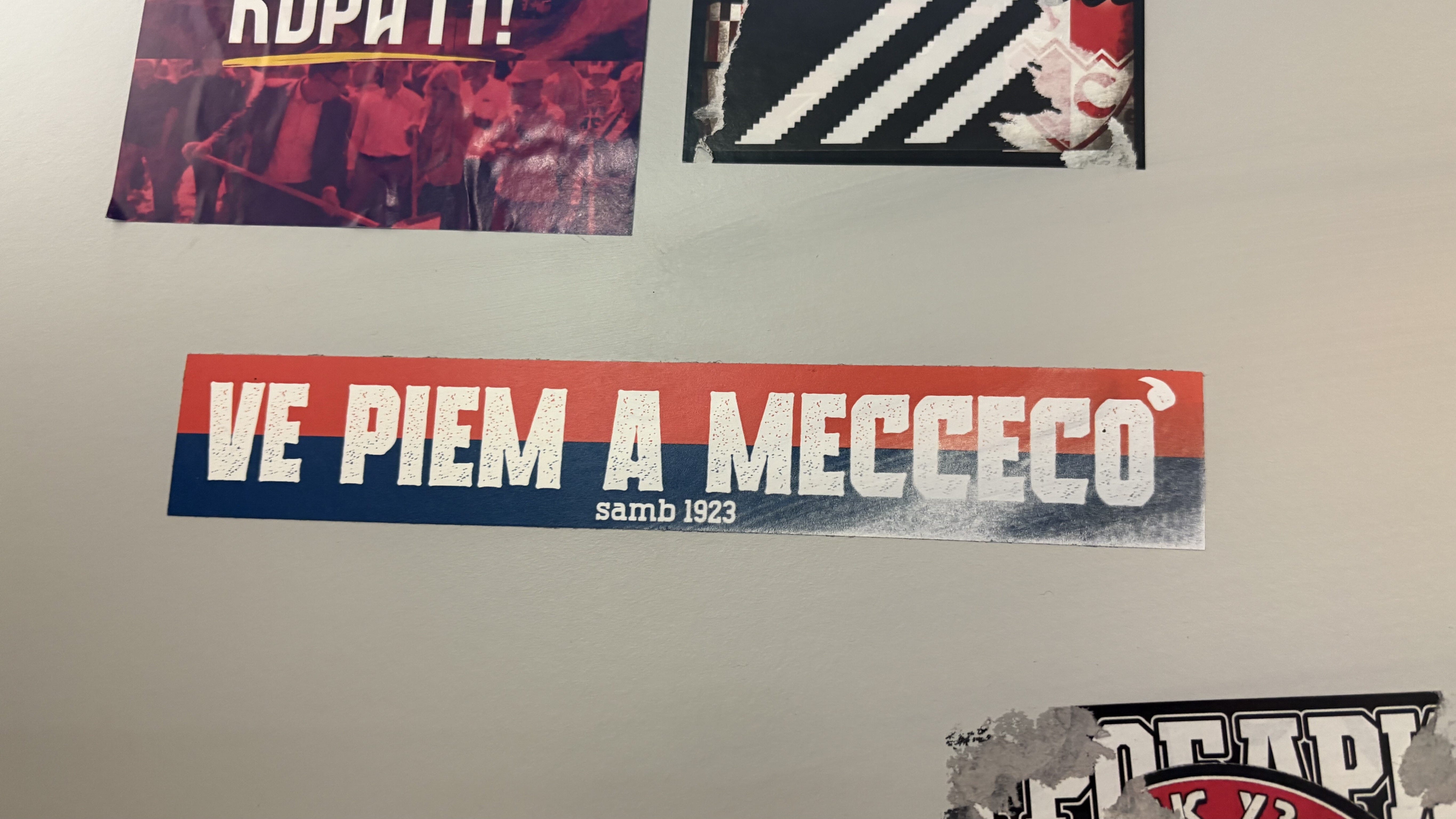 Sia come sia, a un certo punto vado in bagno, alzo lo sguardo e vedo un adesivo. In alfabeto latino, e già è strano, ma soprattutto in dialetto marchigiano (un capo degli ultras del Bologna via WhatsApp me lo ha confermato): “VE PIEM A MECCECÒ”. Sotto, “samb 1923”. Sambenedettese.
